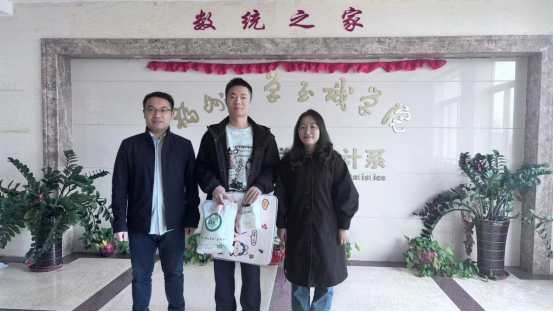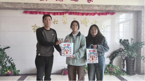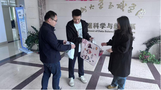 随后,郑恒鑫老师与张文春老师代表数据科学与统计系全体同学为考研的同学们献上了精心准备的考研大礼包。袋内装有精心准备的文具与水果。当同学们感到疲惫时香甜可口的水果便能带来温暖与力量,激励他们继续前行。