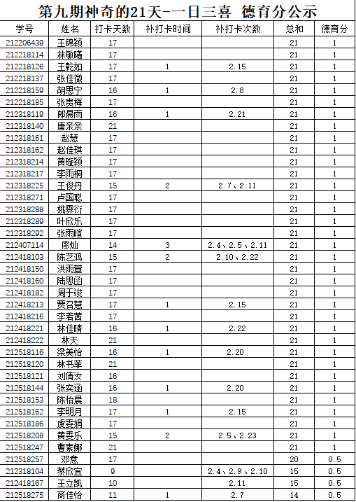 我系以下同学积极参加“第九期‘神奇的21天’”活动,根据活动规则,