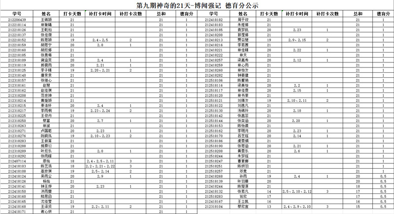 博闻强记和一日三喜:连续21天无打卡缺勤记录的参加者可获得“神奇的21天精英”荣誉证书及1个德育分;连续打卡14天但不足21天将获得0.5个德育分。
