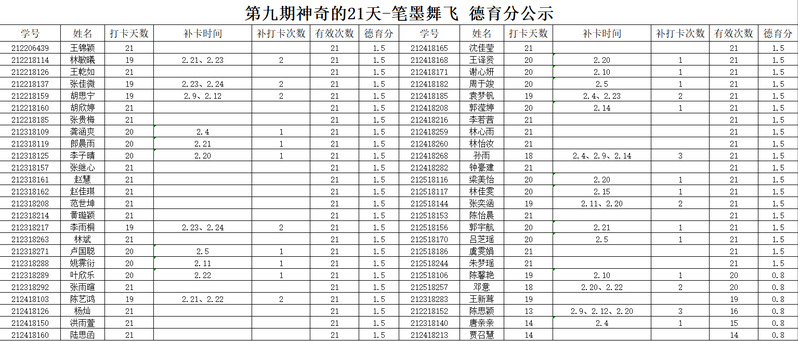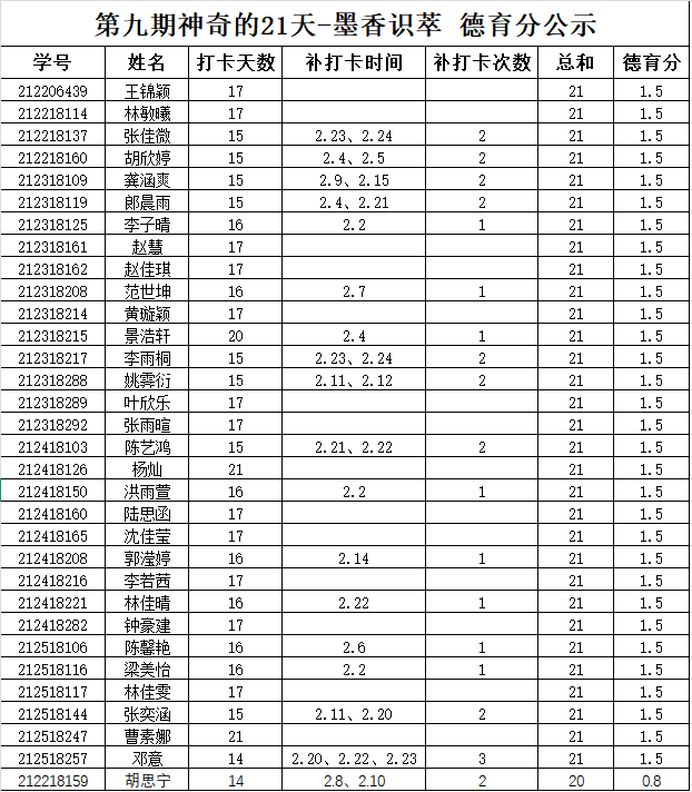 墨香拾萃和笔墨舞飞:连续21天无打卡缺勤记录的参加者可获得“神奇的21天精英”荣誉证书及1.5个德育分;连续打卡14天但不足21天将获得0.8个德育分。